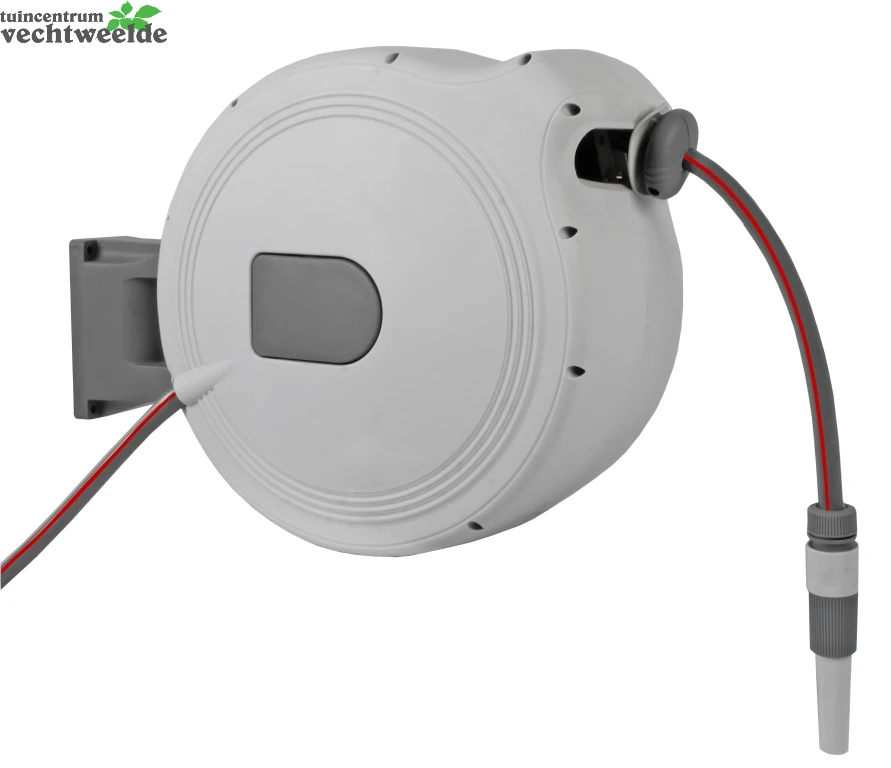 Deze wandslangenbox van 30 meter maakt besproeien eenvoudig en comfortabel. De slang kan met weinig inspanning uit de box worden getrokken en vast gezet worden bij elke lengte. Na gebruik kan de slang automatisch worden opgerold. De praktische slangenbox wordt aan de muur bevestigd en is 180 graden zwenkbaar. Voor de winter kan de slangenbox eenvoudig met de handgreep van de houder afgehaald worden voor opslag in een vorstvrije ruimte. Dit set bestaat uit: 30 meter lange slang, 2 meter verstelbare aansluitslang, 1x verstelbare tuinspuit en 2x slangkoppeling 1/2″